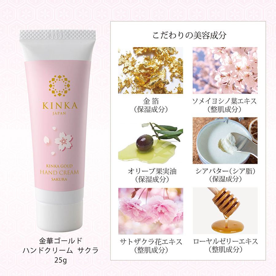 水、エチルヘキサン酸セチル、ステアリン酸グリセリル(SE)、ジメチコン、ペンチレングリコール、BG、グリセリン、ベヘニルアルコール、ステアリン酸、ステアリン酸グリセリル、ステアリン酸PG、オリーブ果実油、カルボマー、水酸化K、バオバブ種子油、パンテノール、シア脂、トコフェロール、グリチルレチン酸ステアリル、ソメイヨシノ葉エキス、サトザクラ花エキス、アスコルビン酸、リンゴ酸、尿素、金、アセチルヒアルロン酸Na、加水分解ヒアルロン酸、ポリクオタニウム-51、加水分解エラスチン、ヒアルロン酸Na、ローヤルゼリーエキス、水溶性コラーゲン、フェノキシエタノール、香料