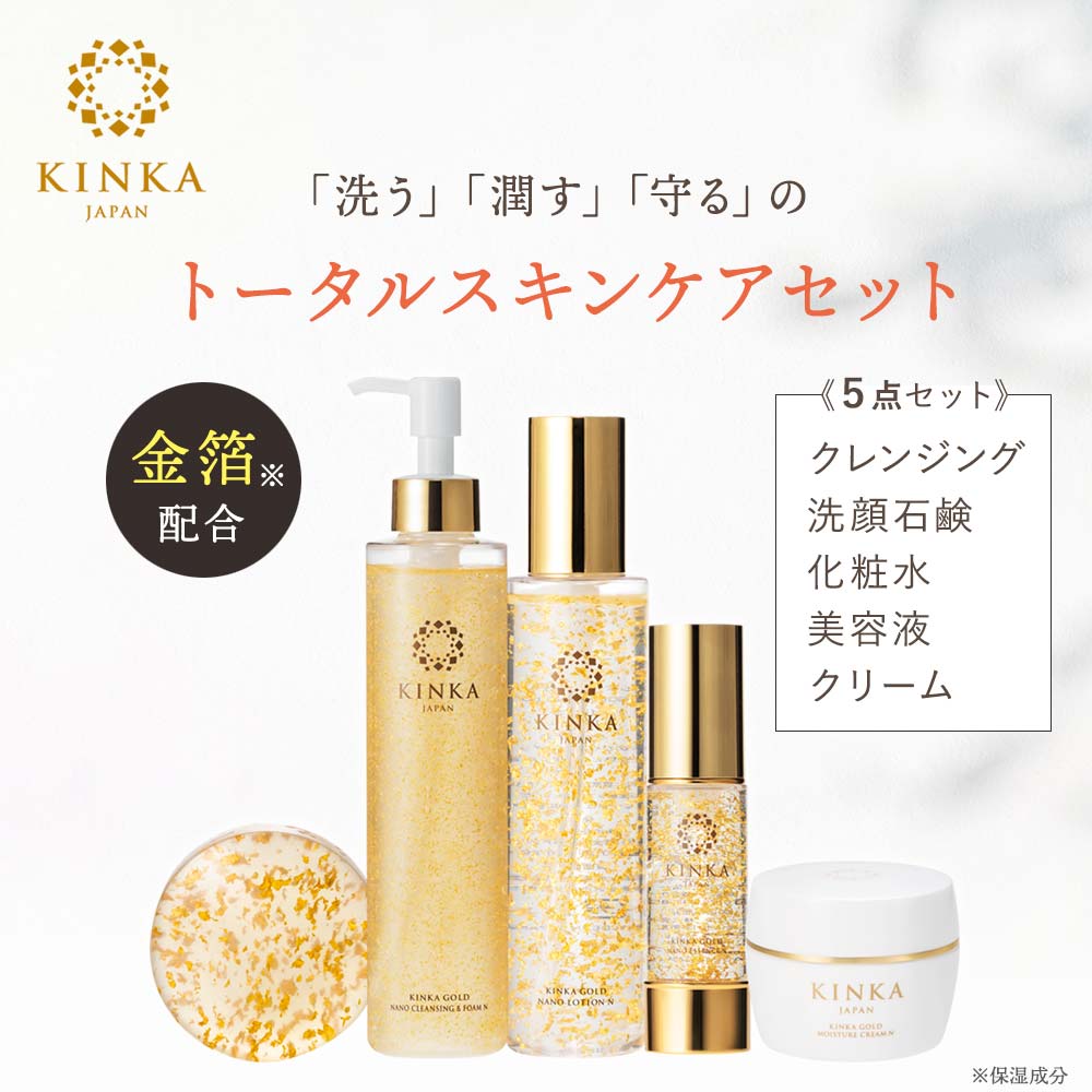 「洗顔」「整肌」「保護」のトータルケアができるクレンジングや石鹸、化粧水や美容液、保湿クリームをセットにしました。 しっかり潤い、お肌が喜ぶ5点セットです。
