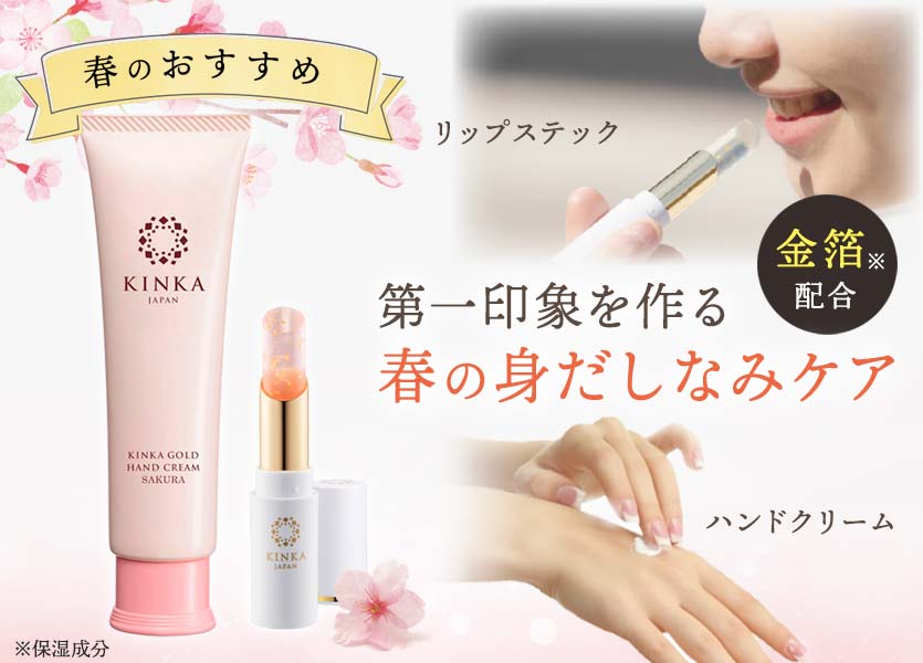 桜の香りが広がる「ハンドクリーム」で手肌をしっとり整え、 「リップスティック」で、乾燥しがちな唇をうるおいで守る。