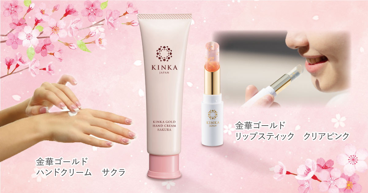 桜の香りが広がる「ハンドクリーム」で手肌をしっとり整え、 「リップスティック」で、乾燥しがちな唇をうるおいで守る。